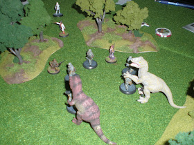 McClure raced to cut the bonds holding the captive with his machete as Ms. Payne distracted the T-Rex with her shotgun and fancy moves. She narrowly escaped being bitten in half only by the grace of spending a lot of Style points and using up her special "Lucky" Talent she gets once a game session. The T-Rex finally reached down to snap up the sacrifice as McClure pushed her out of the way and threw a lizardman drummer forward at the same time, feeding it to the T-Rex Gammorean-guard style. With the death of the drummer the other musician lizardmen stopped playing and started to flee in panic. With the T-rex no longer hypnotized by the music it rampaged around the area attacking things at random. McClure grabbed the damsel and ran past Challenger, the T-rex hot on his heals. Fortunately, Prof. Challenger had in the meantime been attaching a fuse to the overturned truck's gas tank. As the thunderous Superpredator passed the jeep the Professor lit the fuse, and the truck and T-Rex exploded in a tremendous fireball! Prof. Challenger barely leapt out of the path of the explosion into a nearby sinkhole.